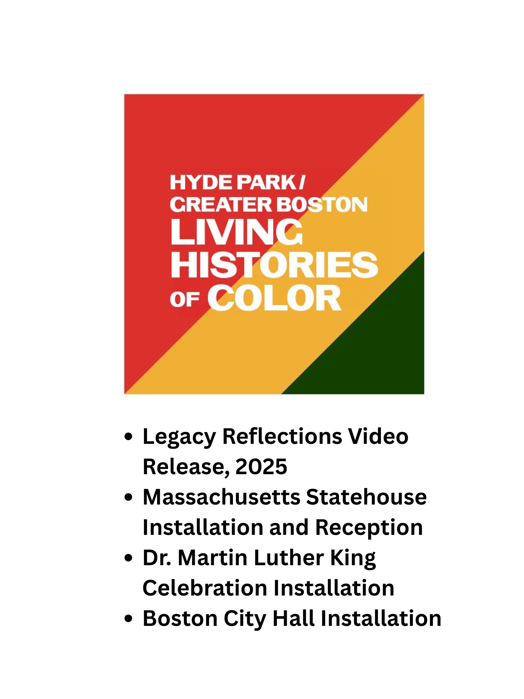 Celebrate the voices, legacies, and resilience of our communities with Living Histories of Color, an inspiring series honoring the stories that shape Hyde Park and Greater Boston. This powerful initiative features a Legacy Reflections Video Release (2025) and a series of public installations that uplift and preserve the contributions of people of color across our region.