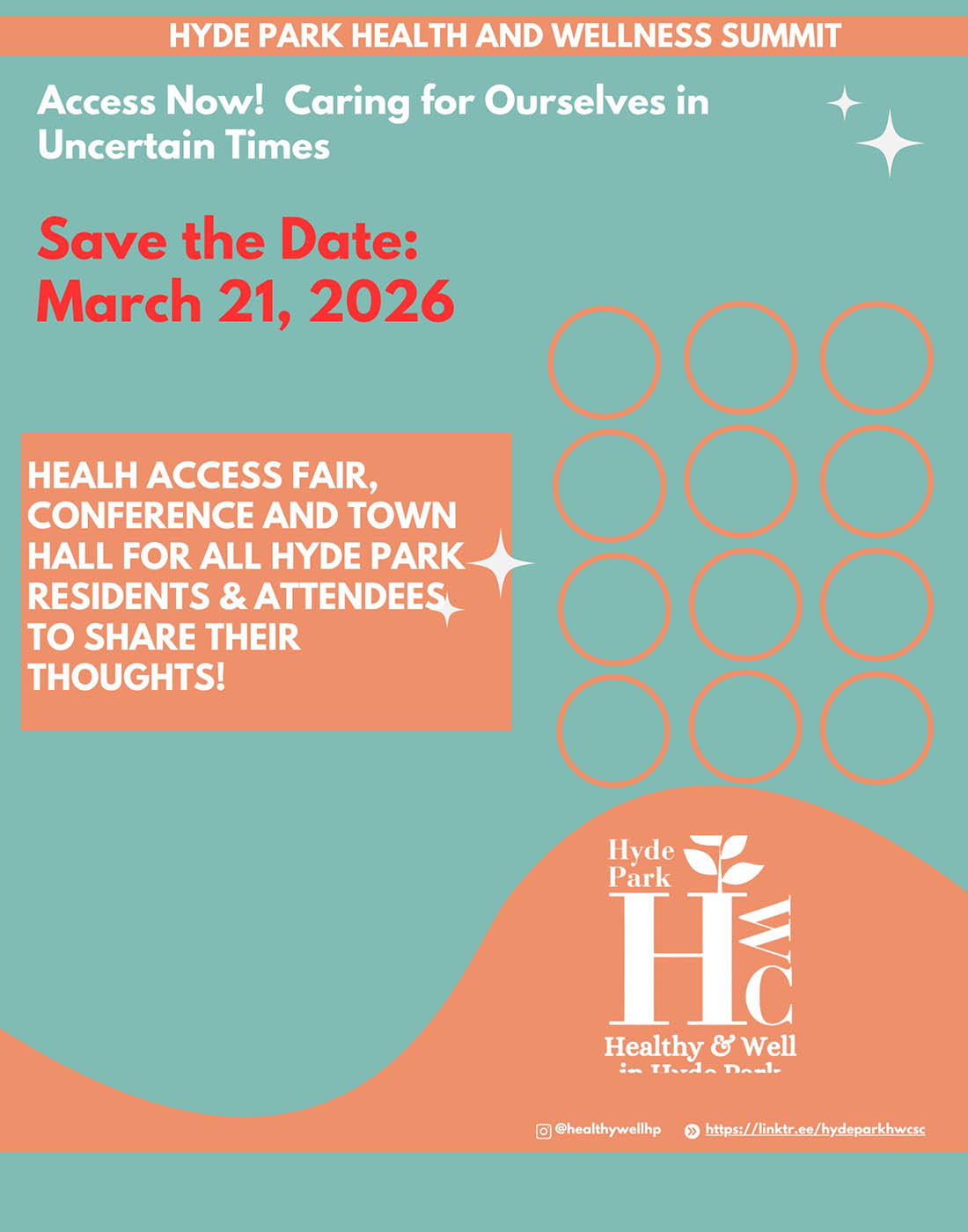Mark your calendars for March 21, 2026, and join us for the Hyde Park Health and Wellness Summit — a day dedicated to empowering our community through access, awareness, and action. This event features a Health Access Fair, Conference, and Town Hall, providing residents and attendees with the opportunity to share their voices, connect with local health resources, and explore strategies for staying healthy and resilient in challenging times.